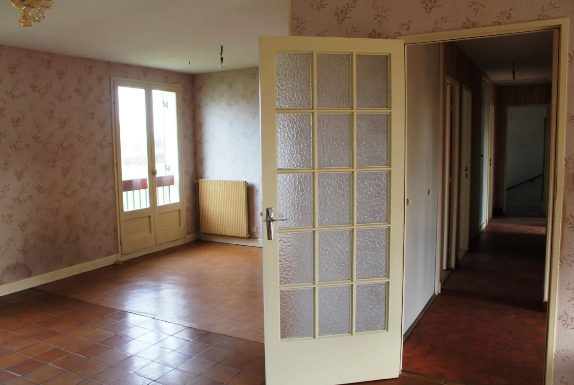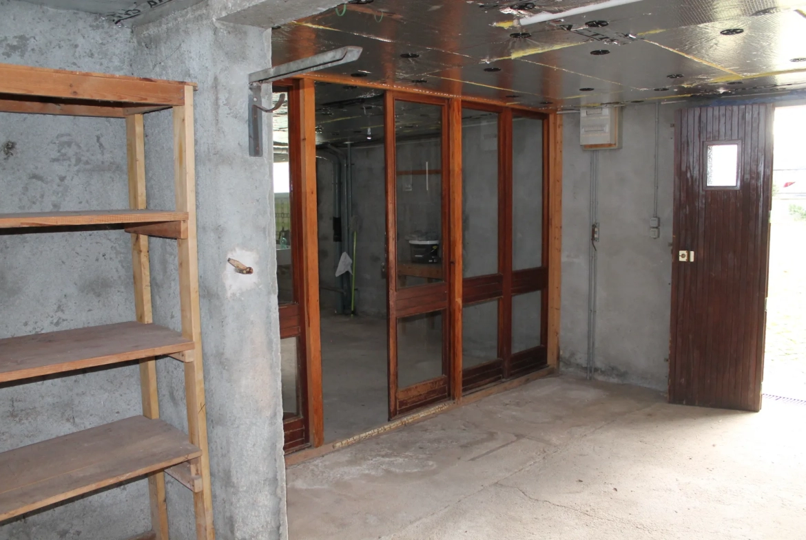 La maison a été construite en 1980, elle est élevée sur sous-sol, avec une surface habitable de 95m2 à l’étage. Elle comprend un balcon, une entrée avec une cuisine à droite et un salon/salle à manger en L à gauche. Il est possible de supprimer une cloison pour créer une cuisine ouverte. Le salon/salle à manger a des portes-fenêtres donnant sur le balcon au Sud, et à l’arrière, une vue sur le jardin. Un couloir avec des placards intégrés mène aux 3 chambres, à la salle de bain et à un WC séparé. Un escalier mène directement au sous-sol où se trouve un bureau ou une quatrième chambre avec un coin douche et un WC séparé. Il y a également une buanderie/cellier pratique avec un évier, une chaufferie indépendante, un garage spacieux avec une partie atelier, et un garage préfabriqué à côté de la maison. Un grand verger avec plusieurs arbres fruitiers et un jardin clôturé se trouvent à l’arrière de la maison. La maison est située sur un chemin tranquille avec vue sur une petite prairie. Les commerces du village sont facilement accessibles à pied. La maison dispose de menuiseries en bois avec du simple vitrage, de volets en bois et d’un chauffage central au fioul. Le sous-sol et les combles sont isolés. L’assainissement est raccordé au réseau collectif communal, il n’y a donc pas de mise aux normes à faire. La maison est habitable immédiatement mais mérite d’être modernisée.